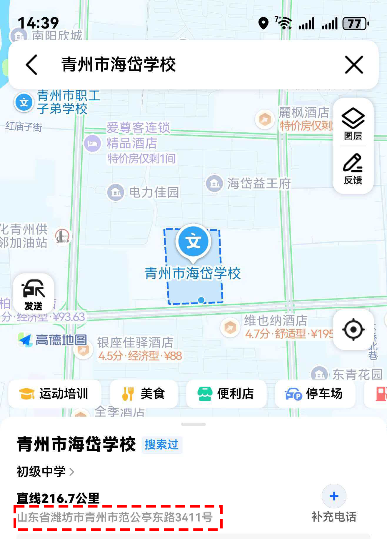 显示【正在处理】就是等 172 平台客服给改地址,需要一定之间才可以轮到你,更推荐代理自己给客户重新下单,地址写什么路几号,下载高德地图 ,例如客户下单的地址是【山东省潍坊市青州市海岱学校】被拒,我们搜索客户的地址如下图【山东省潍坊市青州市范公亭东路 3411 号】,给客户重新下单地址填写什么路几号即可